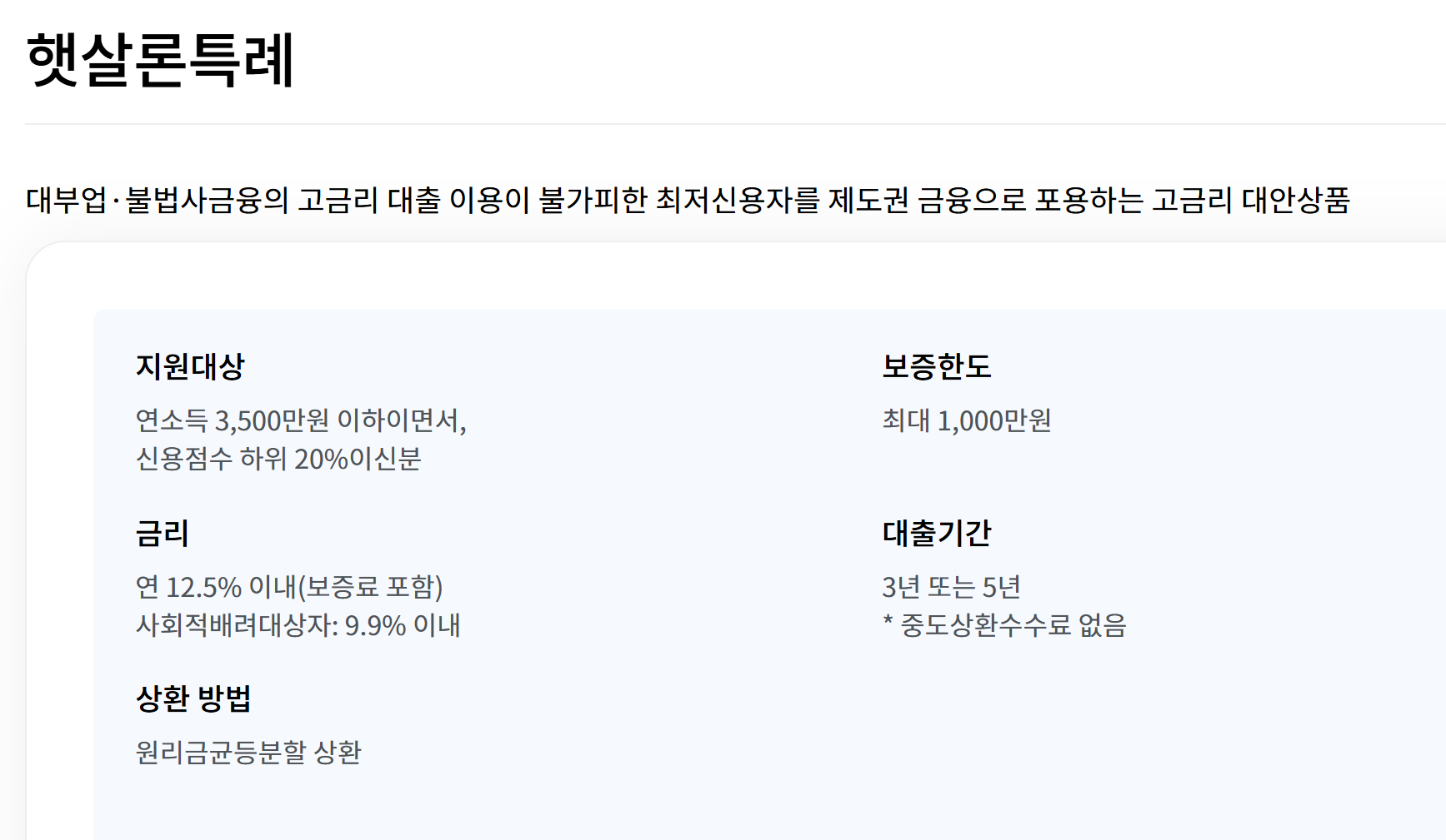 - ✅ 햇살론 특례는 연소득 3,500만 원 이하 + 신용 하위 20%인 최저신용자 전용, 최대 1,000만 원 · 연 12.5% 이내