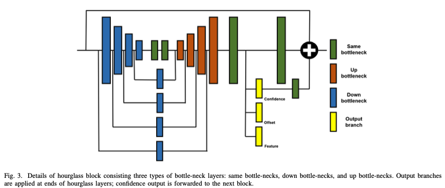 여러 개의 hourglass modules로 구성된 Stacked hourglass networks는 다양한 규모의 정보를 더 깊은 계층으로 전송할 수 있습니다. 이렇게 하면 네트워크가 글로벌 피쳐(global features)과 로컬 피쳐(local features)를 모두 캡처할 수 있습니다. 따라서 hourglass networks는 객체 탐지 작업에서 객체의 중심 또는 모서리를 탐지하는 데 종종 사용됩니다.