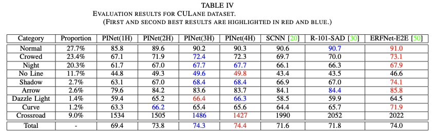 CULane: PINet은 특히 낮은 false positive rate로 CULane 데이터 세트에서 우수한 성능을 발휘하여 안전 성능을 보장합니다. 클리핑된 네트워크 2H 및 3H는 전체 네트워크와 유사한 성능을 보여줍니다. PINet은 조명이 밝은 조건에서는 성능이 우수하지만 local occlusions이나 불분명한 트래픽 라인에 의해 부정적인 영향을 받을 수 있습니다.