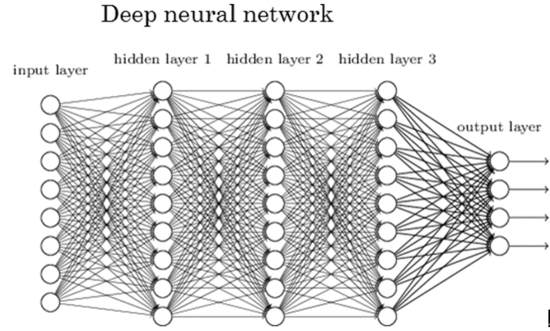 심층 신경망(DNN, Deep Neural Network)은 은닉계층이 한개인 단순한 신경망과는 다르게 층(layer)을 쌓아 층을 더욱 깊게 만든 신경망이다. 입력계층(input layer)과 출력계층(output layer) 사이에 여러개의 은닉계층(hidden layer)들로 이뤄진다.