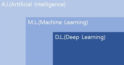 A.I.(Artificial Intelligence)은 사람이 수행하는 지능적 작업을 자동화하기 위한 연구 활동이다. A.I.는 머신 러닝과 딥러닝을 포함하는 종합적인 분야다.