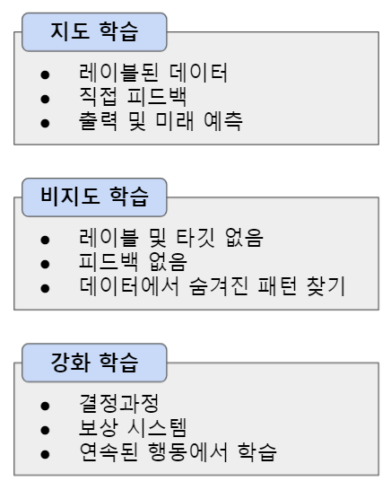 머신러닝의 학습의 종류에는 지도학습(supervised learning), 비지도 학습(unsupervised learning), 강화 학습(reinforcement learning) 3가지 종류가 있다.