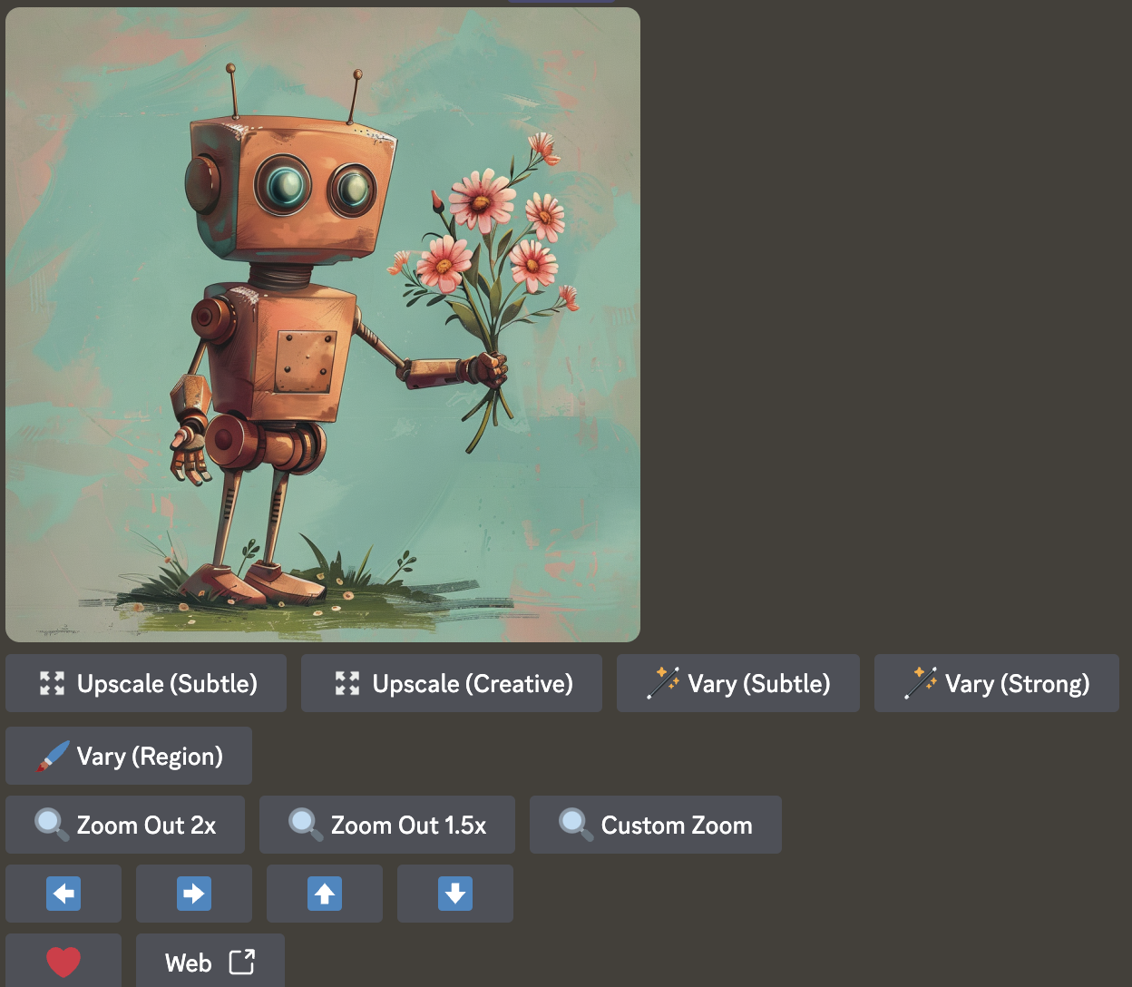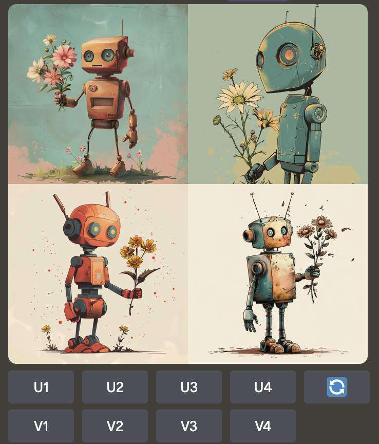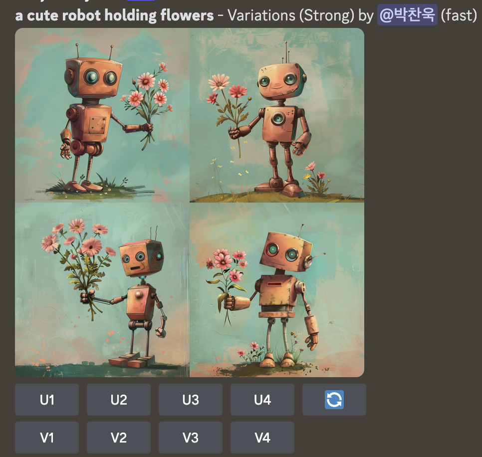 - Low Variation Mode: 로봇의 기본 디자인과 꽃은 유지되지만, 표정이나 자세 등 세부적인 부분이 조금씩 변경될 수 있습니다.