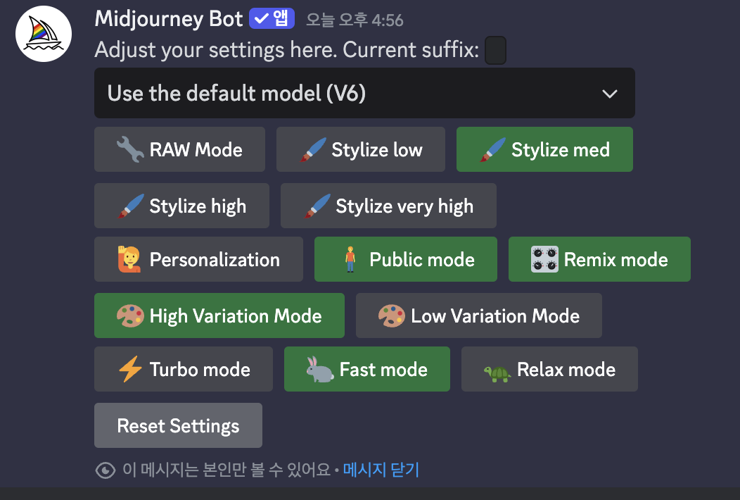 - Reset Settings: 기본 설정으로 복원 (최신 모델 V6, Stylize Med)