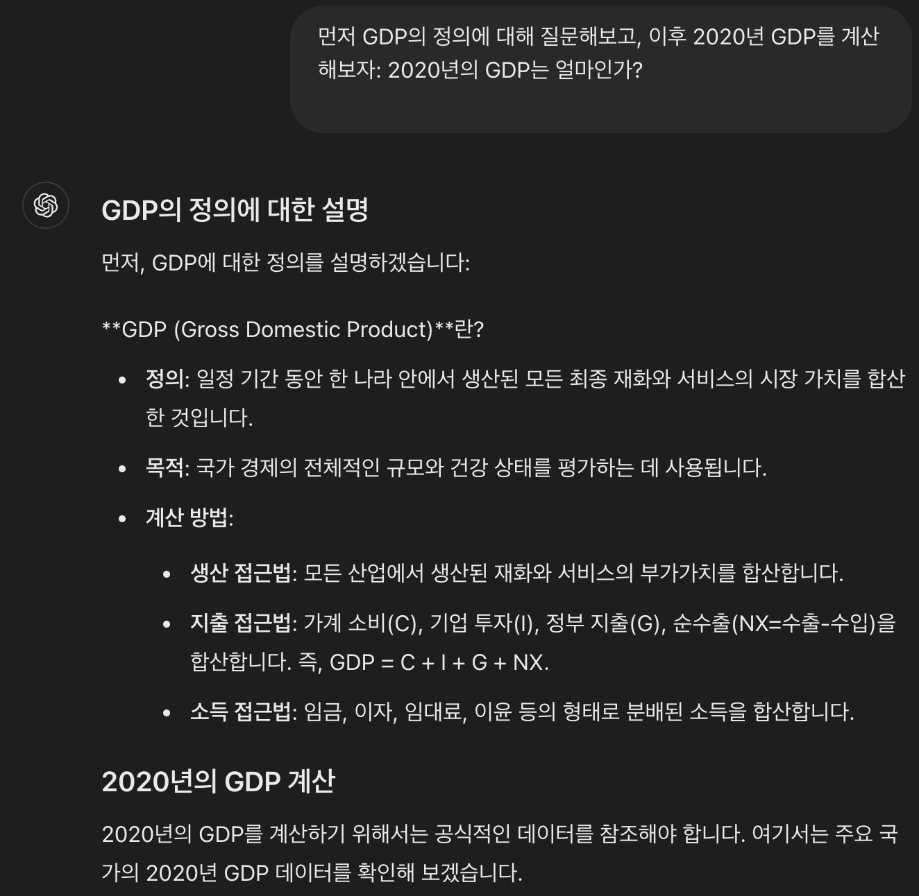 예시: "먼저 GDP의 정의에 대해 질문해보고, 이후 2020년 GDP를 계산해보자: 2020년의 GDP는 얼마인가?"