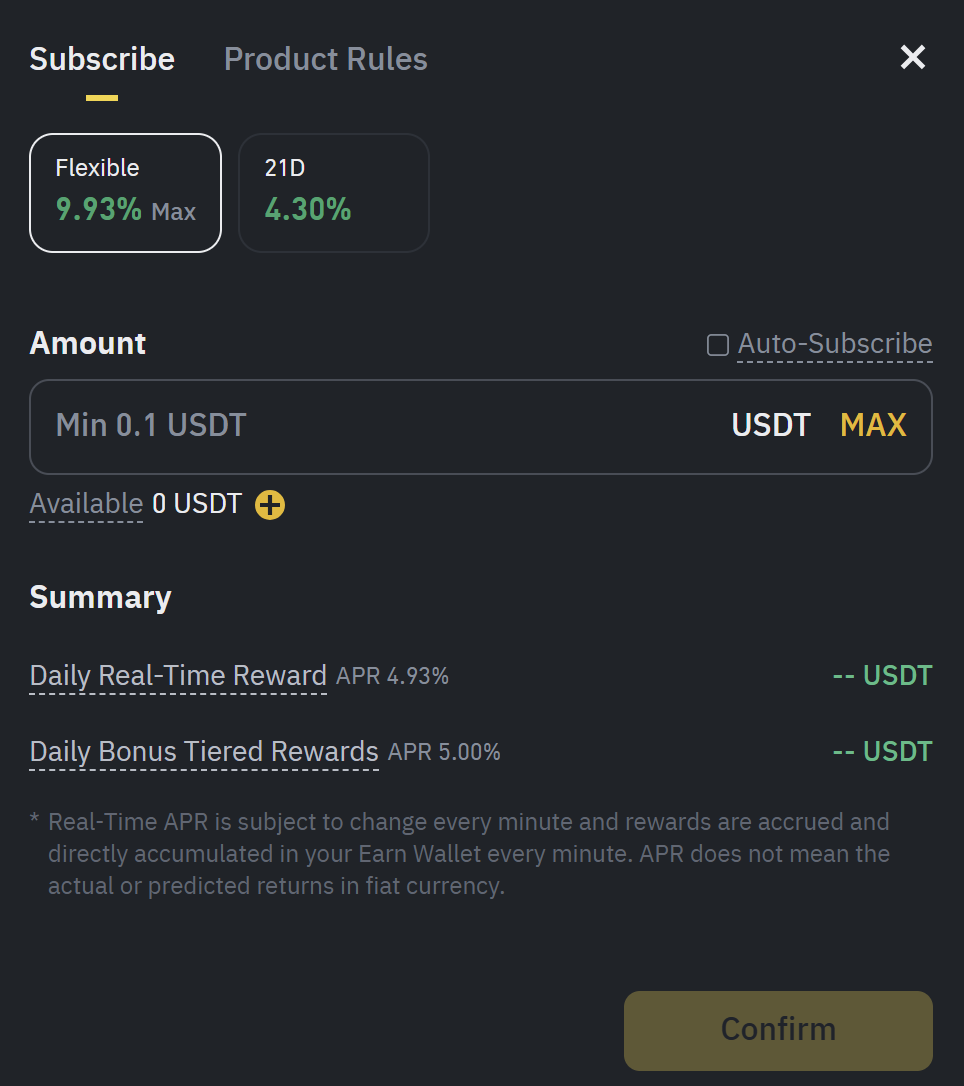 - Auto-Subscribe (자동 구독): 현물 지갑에 새로 유입된 자산을 Simple Earn에 자동으로 예치할 수 있는 기능입니다