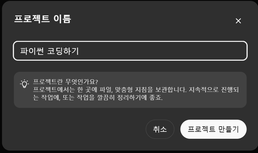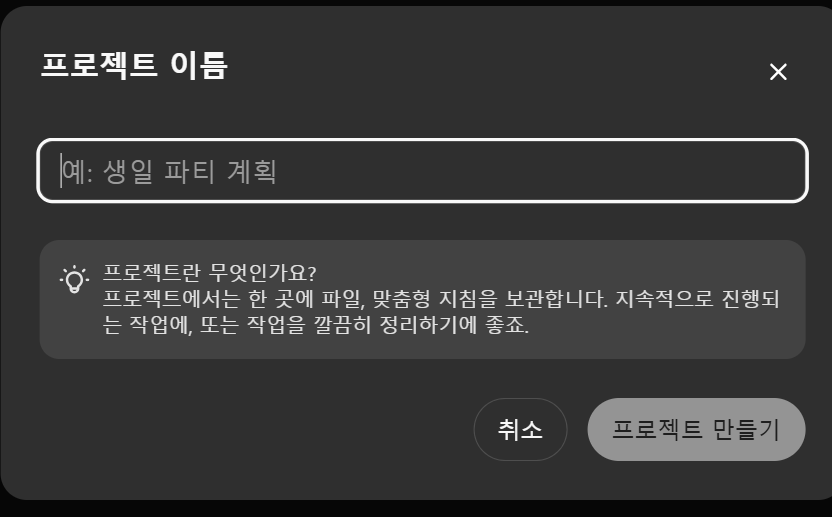 Projects는 파일과 대화를 그룹화하여 관리할 수 있는 새로운 방식입니다. 이를 통해 여러 대화가 필요한 작업을 더 간단하게 관리할 수 있습니다