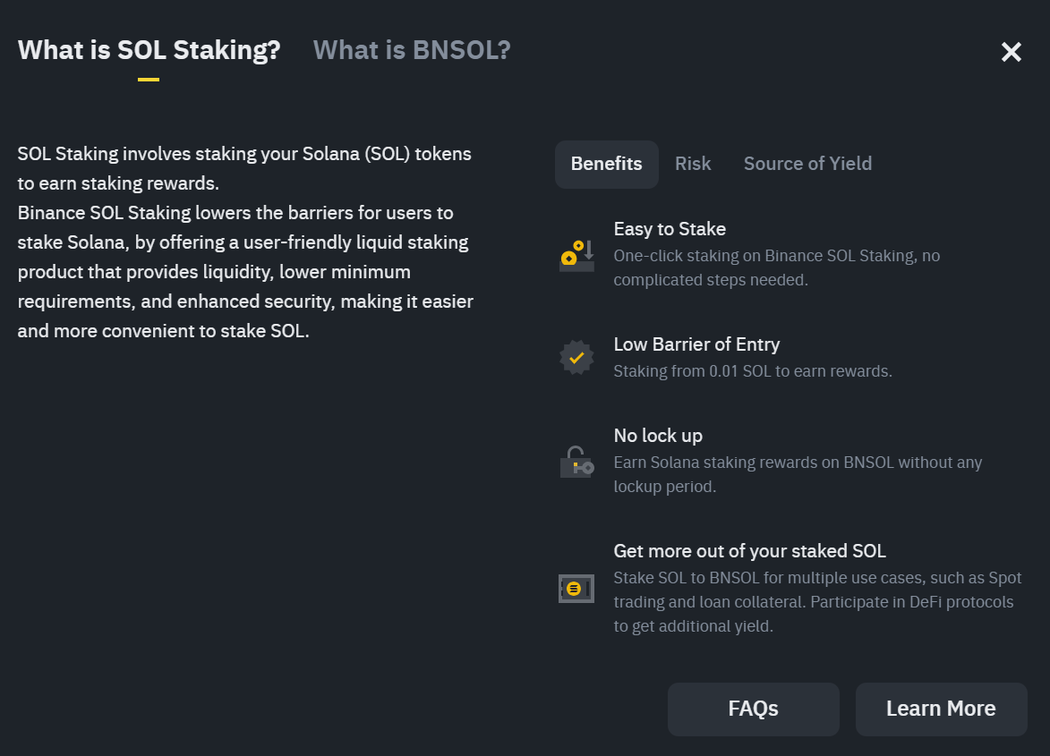 Binance의 Binance SOL 스테이킹은 Solana(SOL) 토큰을 스테이킹하고 BNSOL이라는 유동성 스테이킹 토큰을 받을 수 있는 서비스입니다