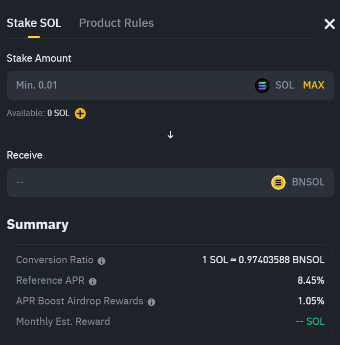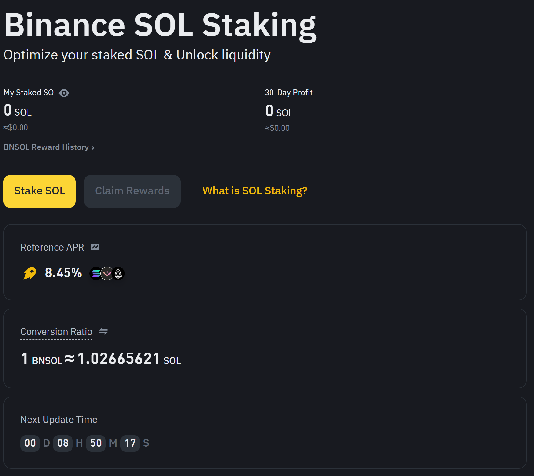 - 보상은 Solana 네트워크의 성능(예: 검증자 효율성 및 참여도)에 따라 결정되며, Binance는 0%의 수수료를 부과합니다