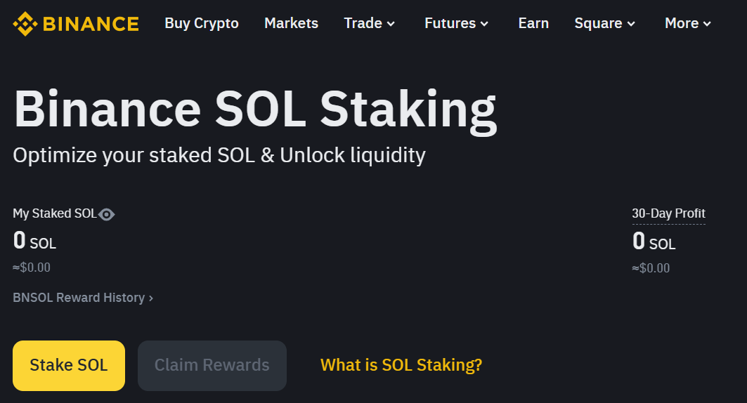 - Binance 계정에 SOL을 입금하거나 구매한 후, Earn 섹션으로 이동합니다