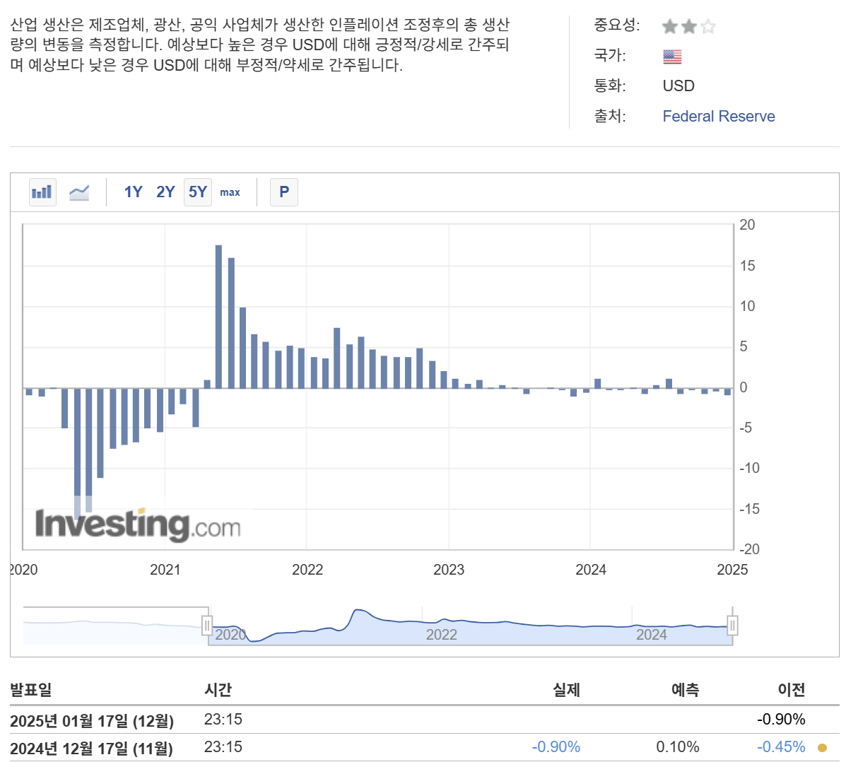 - 산업생산이 감소하거나 예측보다 크게 부진하면 경기 둔화 신호로 간주되어 증시나 달러 가치에 부정적인 영향을 줄 수 있습니다