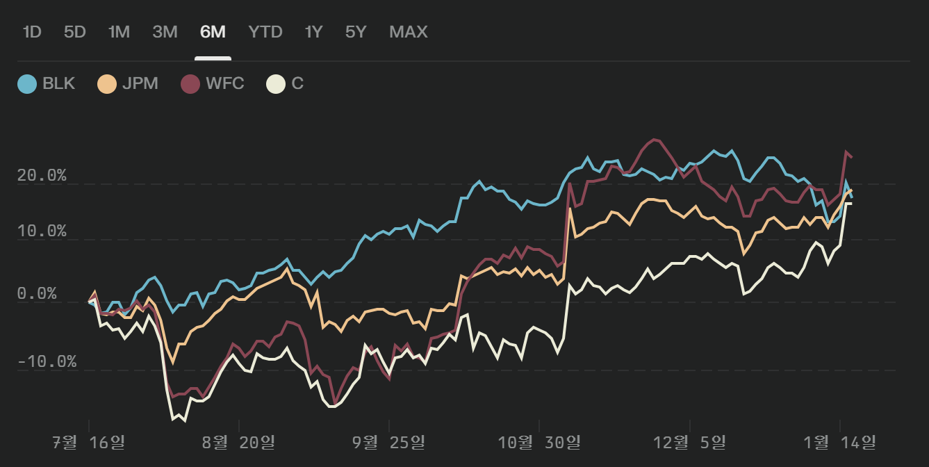 이번 포스팅에서는 블랙록(BlackRock), JPMorgan, 웰스 파고(Wells Fargo), 씨티그룹(Citigroup)의 4개 기업의 실적 발표 내용과 이에 따른 주가 움직임, 그리고 투자자들이 주목해야 할 핵심 포인트를 정리해 보았습니다