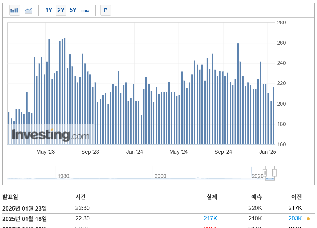 신규 실업수당 청구건수는 매주 발표되는 지표로, 말 그대로 ‘새롭게 실업수당을 청구한 사람들의 수’를 의미합니다. 이 지표가 늘어나면 그만큼 경제 활동 인구 중에서 실업 상태가 된 사람이 많아졌다는 뜻이므로, 경기 둔화가 우려된다는 신호로 해석될 수 있습니다. 반면, 신규 실업수당 청구건수가 줄어든다면 노동시장이 건재하다는 의미가 되겠죠