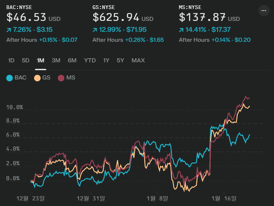 2025년 1월 16일(현지 시각)에 미국의 대표적인 대형은행 뱅크오브아메리카(Bank of America, BAC), 골드만삭스(Goldman Sachs, GS), 모건스탠리(Morgan Stanley, MS)가 2024년 4분기 실적을 발표했습니다