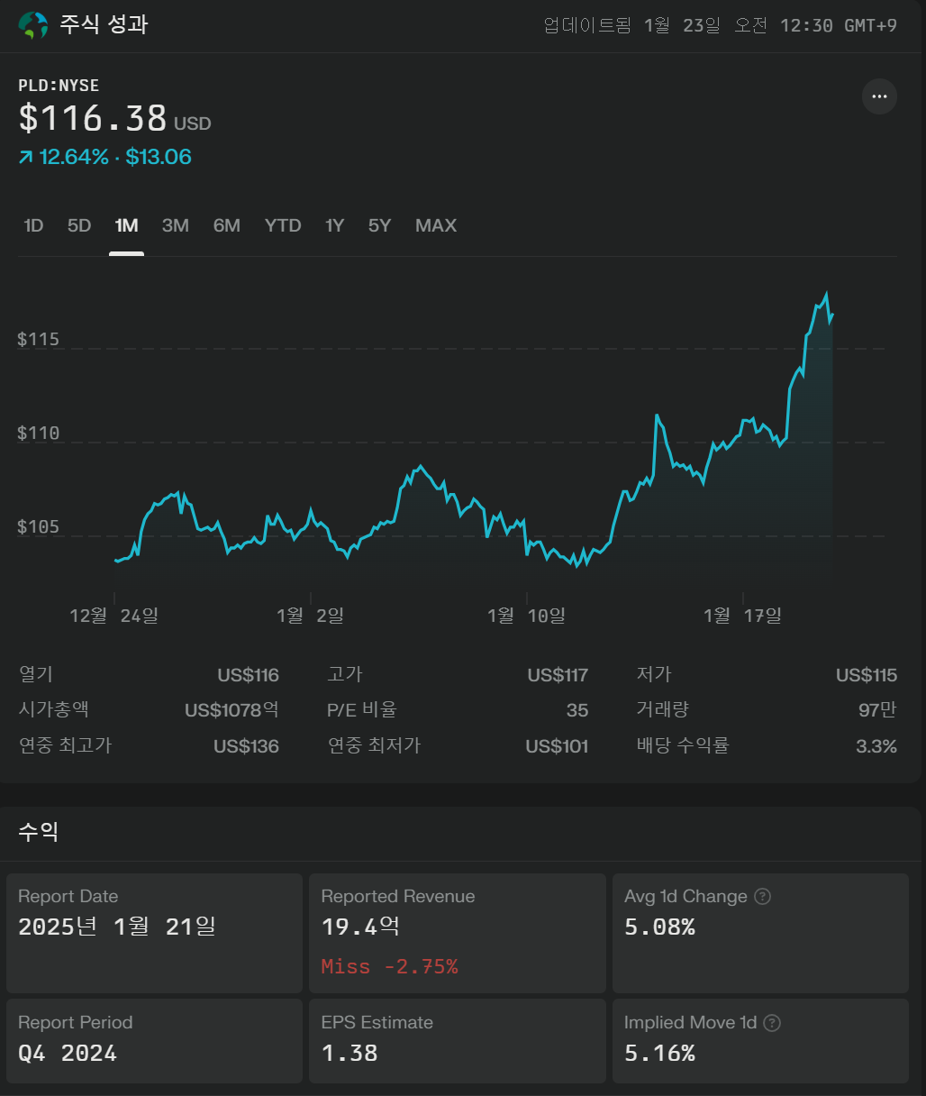 - 미미한 주가 상승: 실적 발표 후 2025년 1월 21일, Prologis 주가는 0.65% 상승한 110.19달러를 기록했습니다