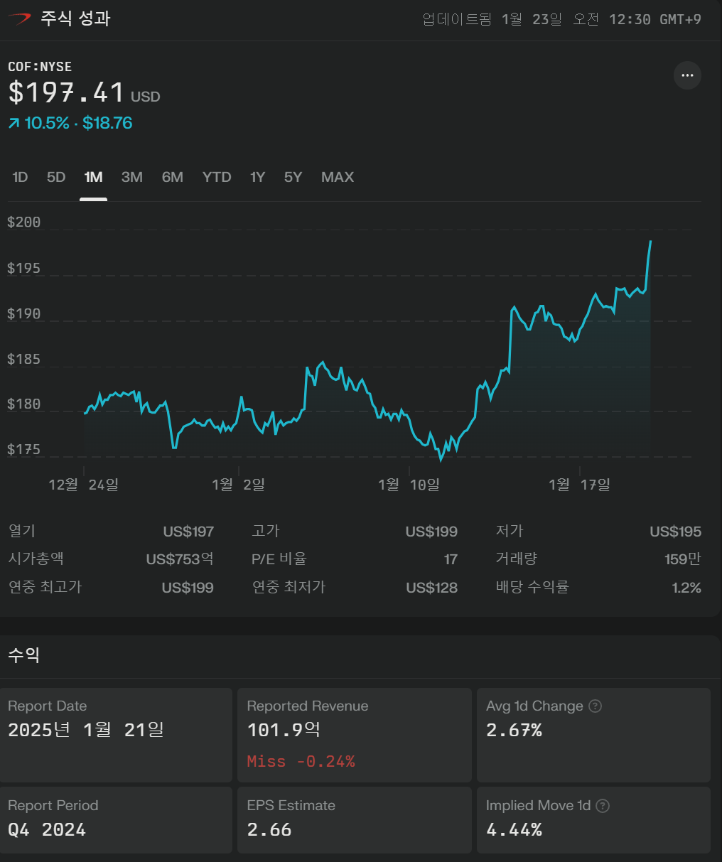 - 긍정적인 주가 반응: 실적 발표 후 2025년 1월 21일, Capital One 주가는 193.23달러로 마감하며 투자자들의 긍정적인 반응을 이끌어냈습니다