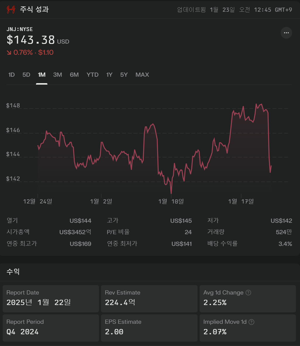 - 시장 반응: 예상보다 낮은 연간 가이던스와 Stelara 바이오시밀러 경쟁 우려로 인해 J&J 주가는 발표 후 약 1% 하락하여 $143.33에 거래를 마쳤습니다