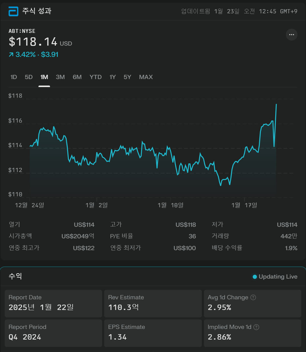 - 실적 결과: 애보트는 2024년 4분기 매출 $109억 7천만 달러(전년 대비 +7.2%)와 조정 EPS $1.34를 기록하며 월가 예상치($1.34 EPS)와 일치했으나 매출은 소폭 하회했습니다. 의료기기 부문은 유기적 성장률 +14%로 두드러진 성과를 냈습니다