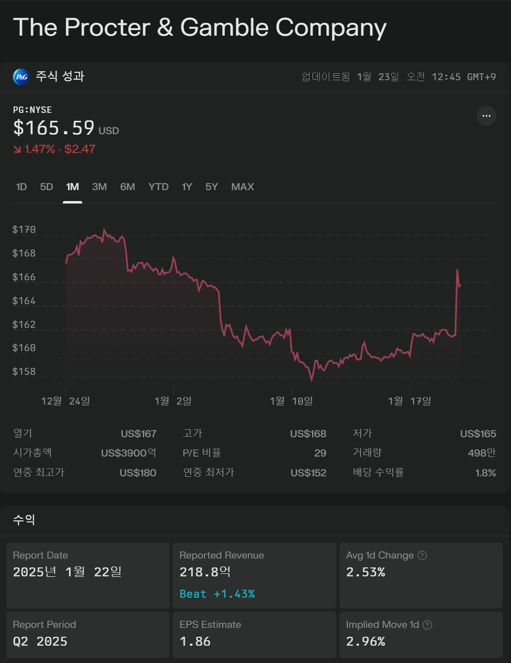 - 시장 반응: 실적 발표 직후 P&G 주가는 프리마켓에서 약 2.5% 상승했으며, 거래일 중 최고 $167.80까지 올랐다가 $165.33에 마감했습니다. 투자자들은 안정적인 성장 전망에 긍정적인 반응을 보였습니다