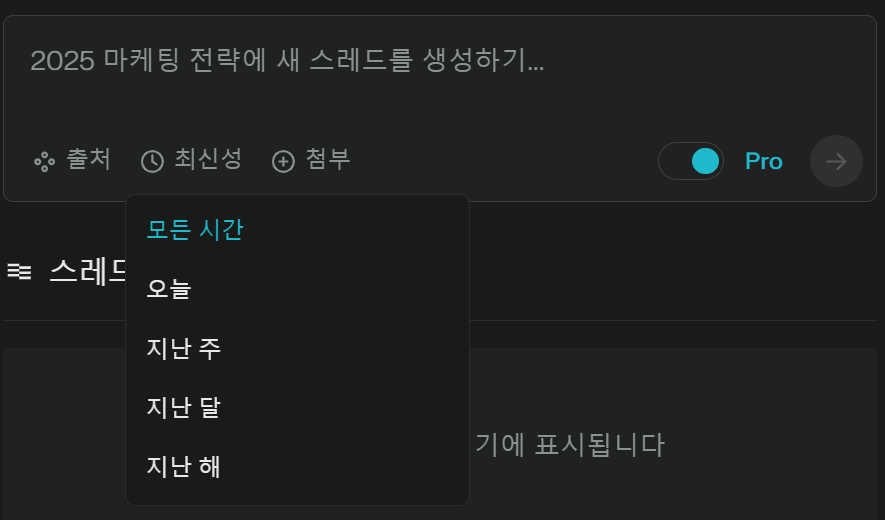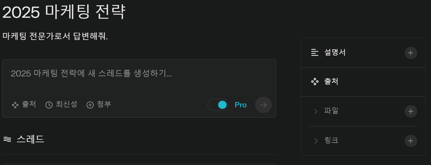 - 연구 정리: 특정 주제나 프로젝트별로 별도의 작업 공간을 만들어 관련된 모든 스레드, 파일, 검색 결과를 한곳에 보관
