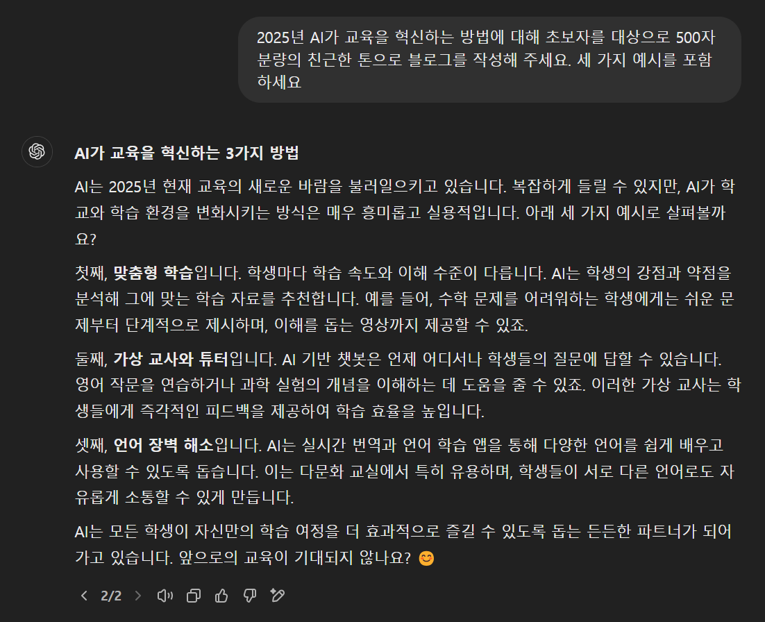 - 구체적인 지시 제공: ChatGPT에 주제, 타겟 독자, 톤, 원하는 구조 등을 상세히 전달하세요. 예를 들어, "AI에 대한 블로그를 작성해 주세요" 대신, "2025년 AI가 교육을 혁신하는 방법에 대해 초보자를 대상으로 500자 분량의 친근한 톤으로 블로그를 작성해 주세요. 세 가지 예시를 포함하세요"라고 요청해 보세요