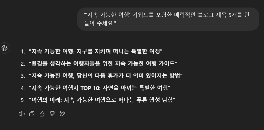 - SEO 친화적인 제목, 메타 설명, 키워드 제안을 요청하세요. 예: "'지속 가능한 여행' 키워드를 포함한 매력적인 블로그 제목 5개를 만들어 주세요."