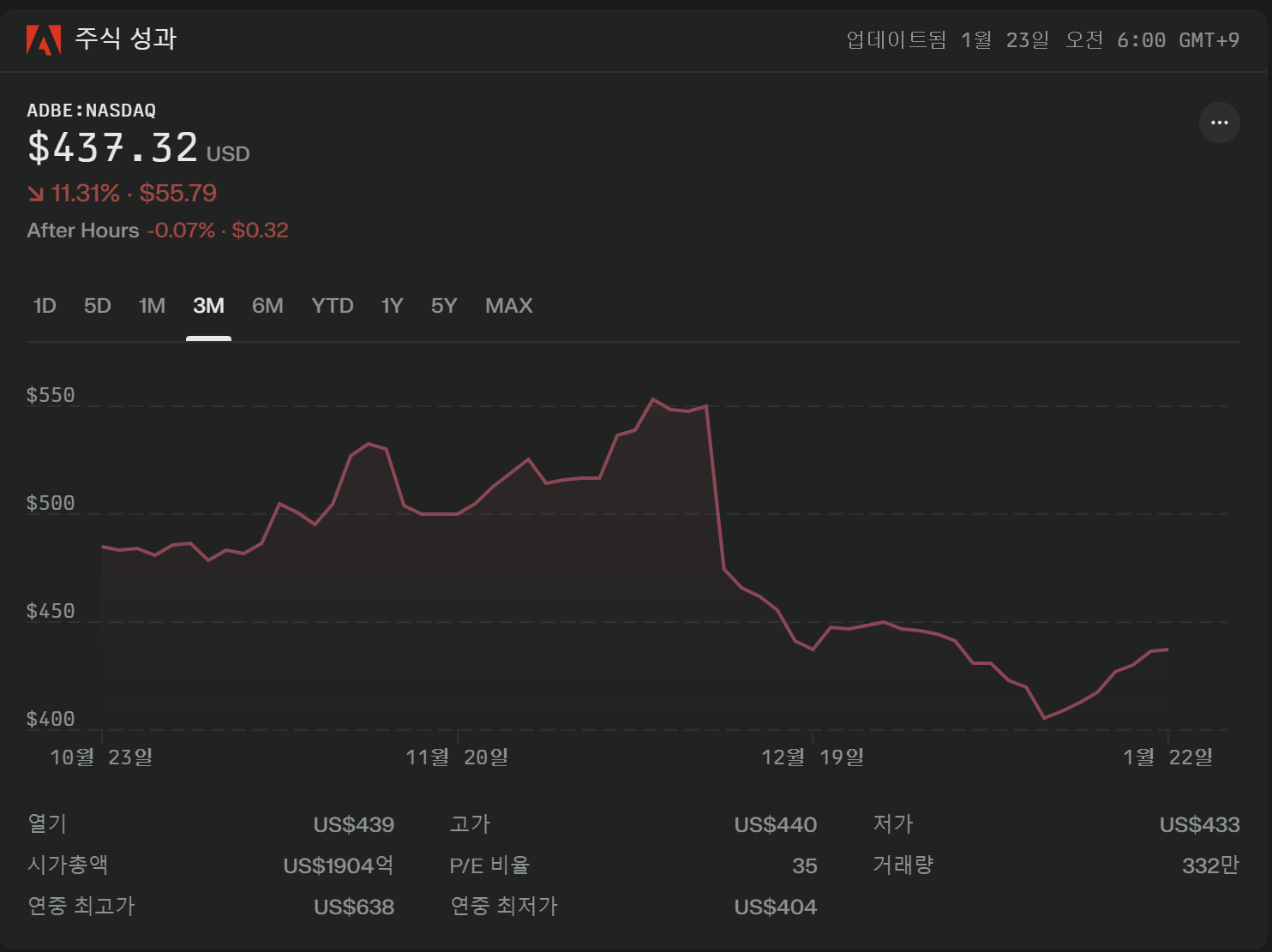 2025년 1월 22일 기준, Adobe 주가는 $437.32로 거래되고 있으며, 이는 52주 최고가 $638.25에서 크게 하락한 수준이지만 최근 최저가 $433.97보다는 약간 높은 수준입니다