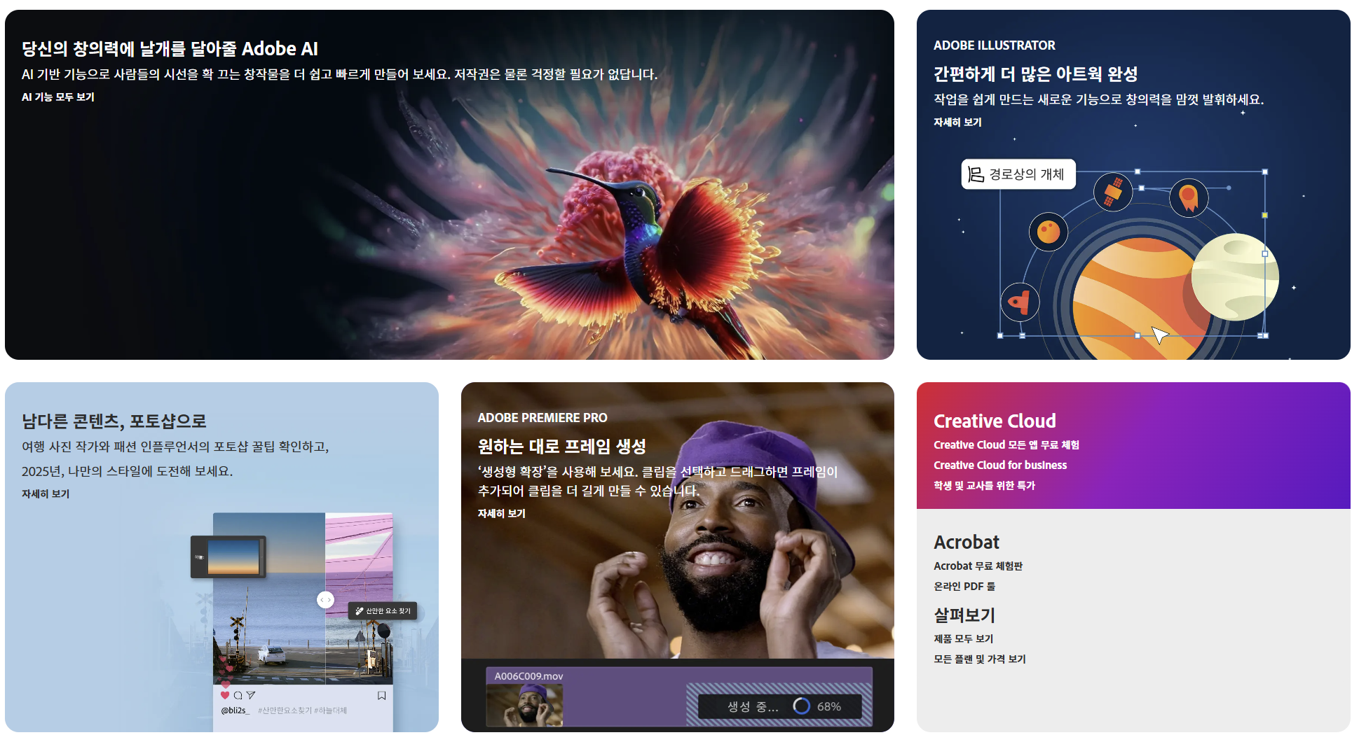 - Creative Cloud: 사진, 디자인, 비디오 편집 및 일러스트레이션을 위한 업계 최고의 소프트웨어 (예: Photoshop, Illustrator)