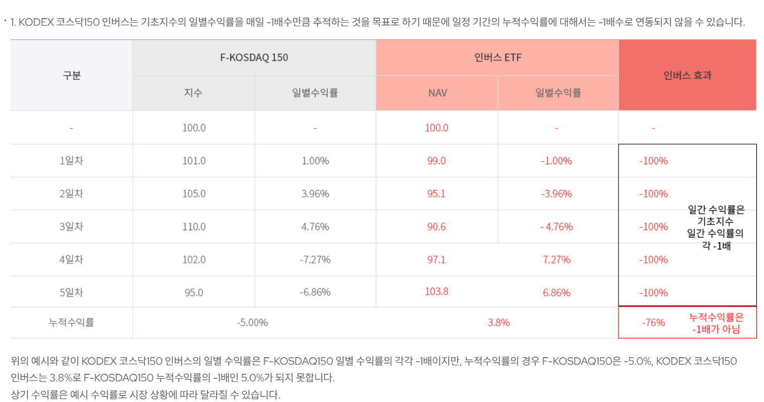 - 역방향 추종: 코스닥 150 지수가 1% 하락하면, 코스닥 인버스 ETF는 1% 상승합니다
