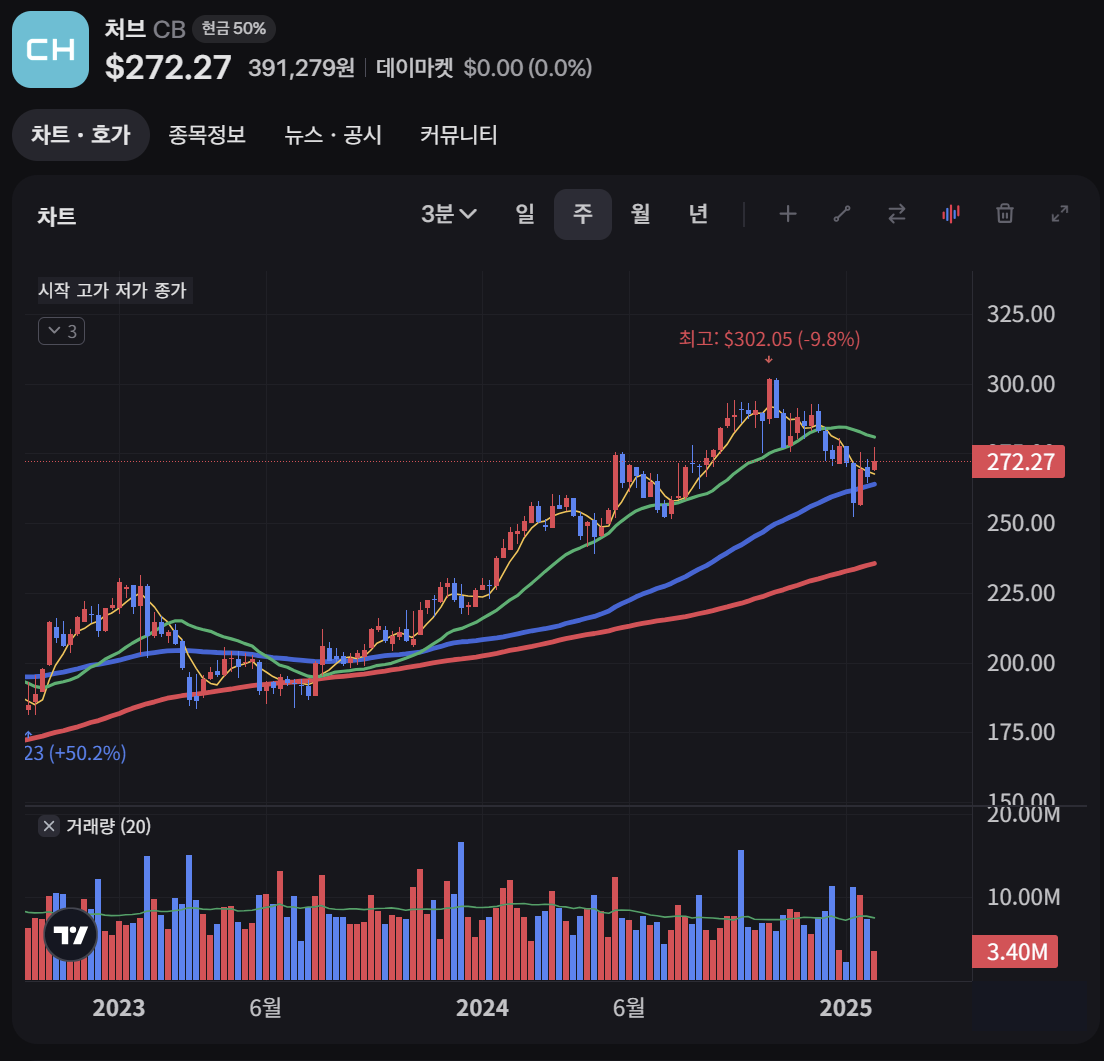 처브는 안정적인 보험업 성과를 바탕으로 장기 투자에 적합한 종목입니다. 시장 변동성과 관계없이 꾸준한 수익을 원하는 투자자에게 적합한 선택지가 될 수 있습니다