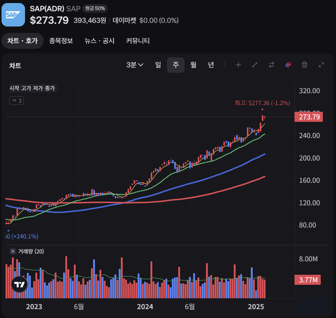 SAP는 클라우드 및 AI 분야에서 강력한 성장세를 보이고 있지만, 현재 주가가 과대평가되었을 가능성이 있습니다. 단기적으로 가격 조정이 있을 수 있으므로 추가적인 하락 기회를 기다리는 것이 바람직합니다