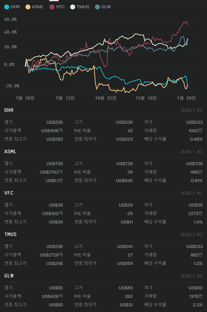 2025년 1월 30일 기준 ASML, Danaher, VF Corp, T-Mobile US, Corning의 최신 실적 발표 내용을 바탕으로 기업별 사업 개요, 재무 성과, 시장 반응 및 투자 의견을 종합 분석합니다