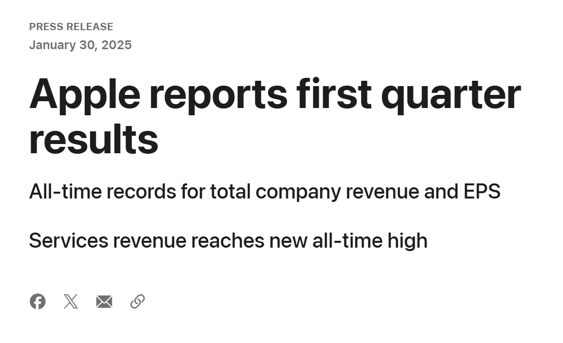 - 주가 반응: 분기 실적 자체는 호조였으나, 아이폰 판매 둔화 등 성장성 우려로 발표 후 주가는 1.5% 하락