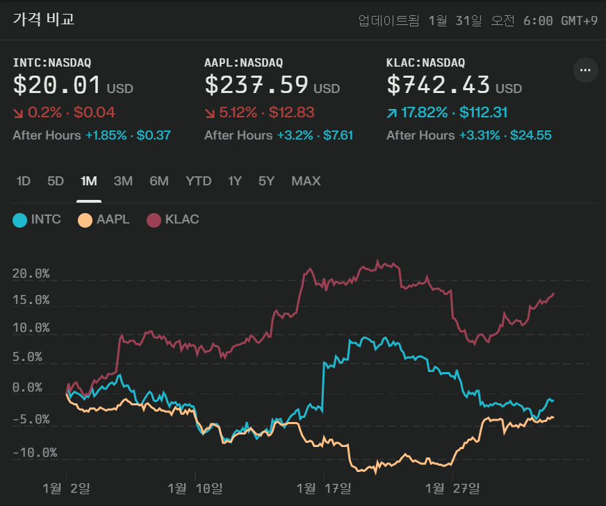 | 항목 | 인텔 (INTC) | 애플 (AAPL) | KLA (KLAC) |