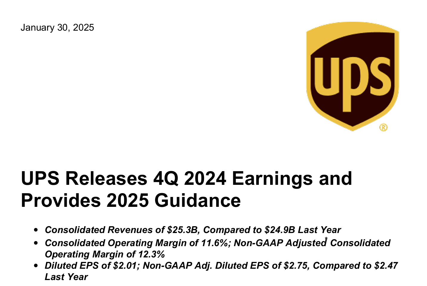 - 📊 2024년 4분기 실적: UPS의 매출은 253억 달러(전년 대비 +1.5%)로, 시장 예상치(254.2억 달러)보다 다소 낮았습니다. 조정된 주당순이익(EPS)은 2.75달러로 예상치(2.53달러)를 초과했습니다