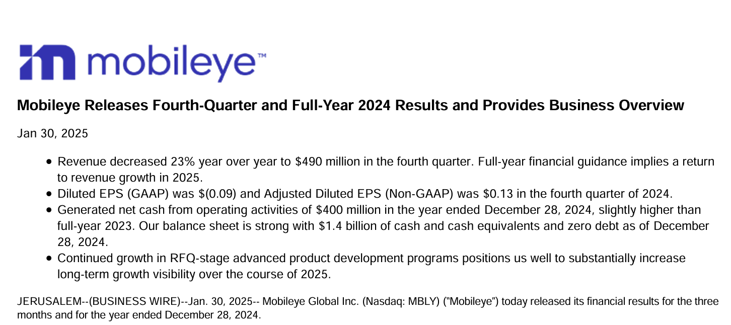 - 📊 2024년 4분기 실적: Mobileye의 매출은 4억 9천만 달러(전년 대비 -23%)로, 예상치(4억 7,800만 달러)를 상회했지만 ADAS 시장 내 지속적인 도전 과제를 반영하고 있습니다. 조정된 EPS는 0.13달러로 예상치(0.11달러)를 초과했습니다