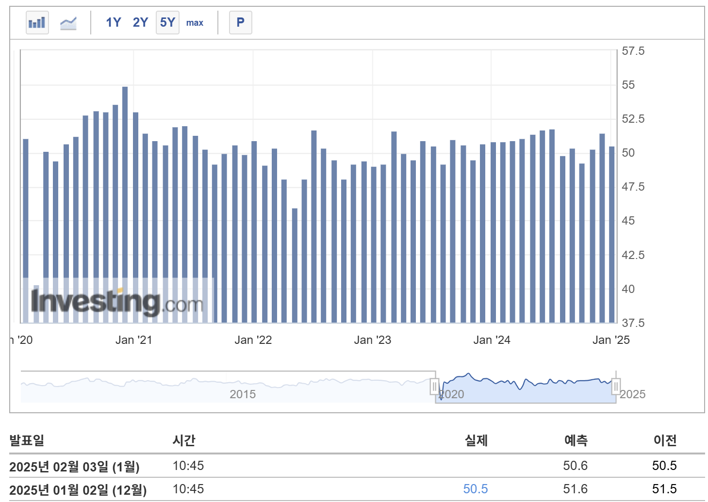 - 50 이상: 제조업 활동이 확장되고 있음을 의미 📈
