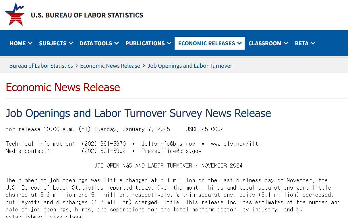 JOLTS(구인 및 이직 조사)는 미국 기업들의 구인 건수를 측정하는 중요한 노동시장 지표입니다. 노동시장이 강하면 기업들이 많은 인력을 필요로 한다는 신호이며, 임금 상승 압력과 함께 중앙은행(Fed)의 긴축 정책 가능성이 커질 수 있습니다