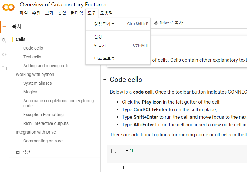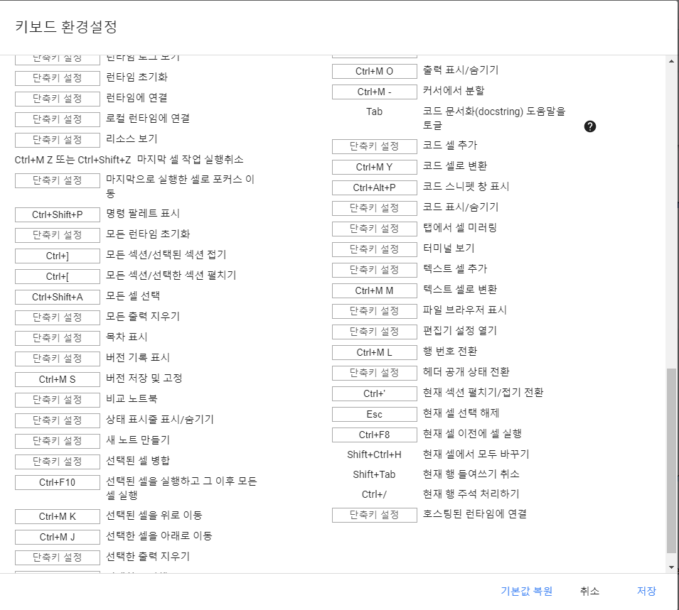 IT/colab Colab 단축키 모음 by icebear3000 2022. 11. 22. 반응형 colab의 단축키는 도구 - 단축키에 들어가면 확인할 수 있으며 단축키를 원하는대로 설정 가능하다.(customize 가능) <colab 화면> <colab 단축기 설정> 반응형 공유하기 게시글 관리 icebear 저작자표시 (새창열림) 댓글