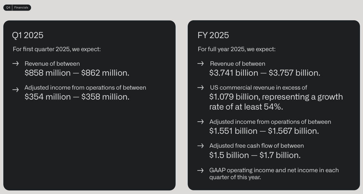 Palantir는 2025년 1분기와 전체 회계연도에 대해 구체적인 가이던스를 제시했습니다