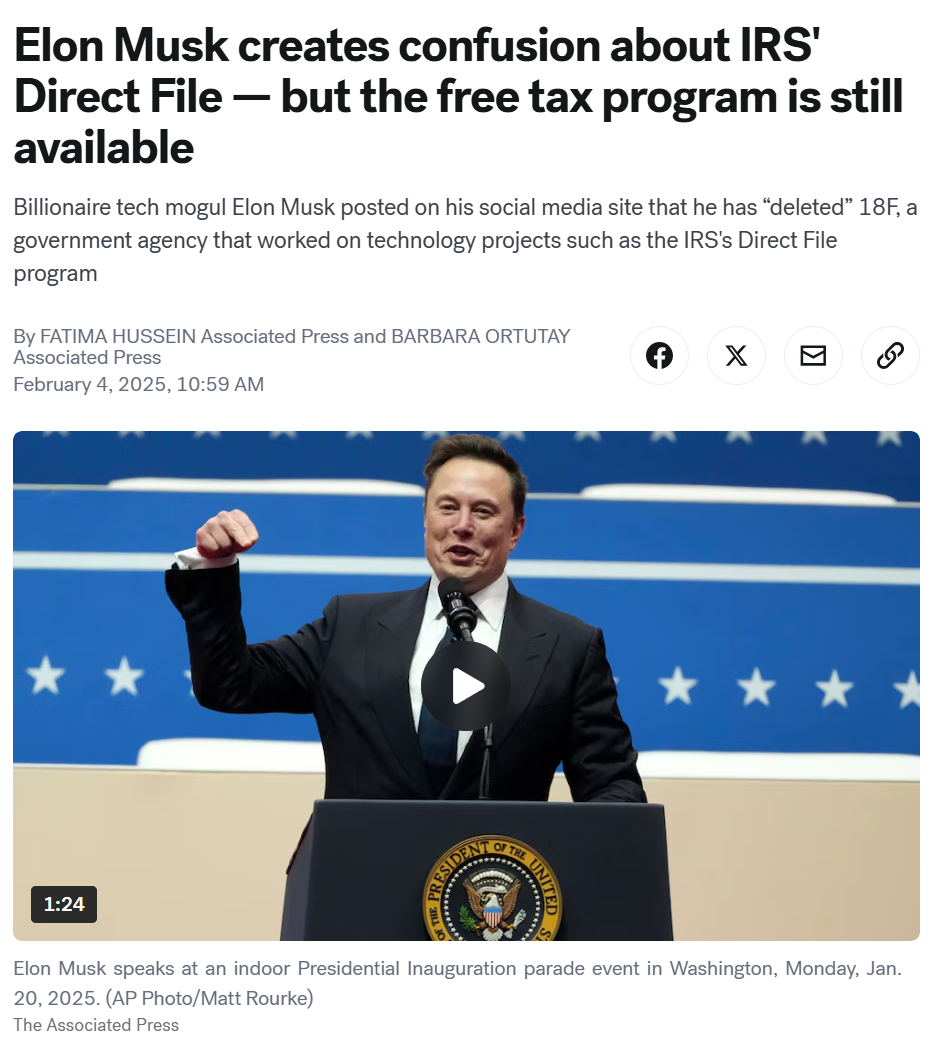 2025년 2월 3일, 일론 머스크는 자신의 소셜 미디어 플랫폼 X(구 트위터)를 통해 정부 기술 기관인 18F를 “삭제”했다고 언급했습니다. 18F는 IRS Direct File 프로그램 개발에 관여했던 기관으로, 머스크의 발언은 Direct File 프로그램의 운영에 혼란을 불러일으켰습니다. 그러나 IRS 측은 이번 세금 시즌 동안 Direct File 프로그램이 정상 운영 중임을 재차 밝혔습니다