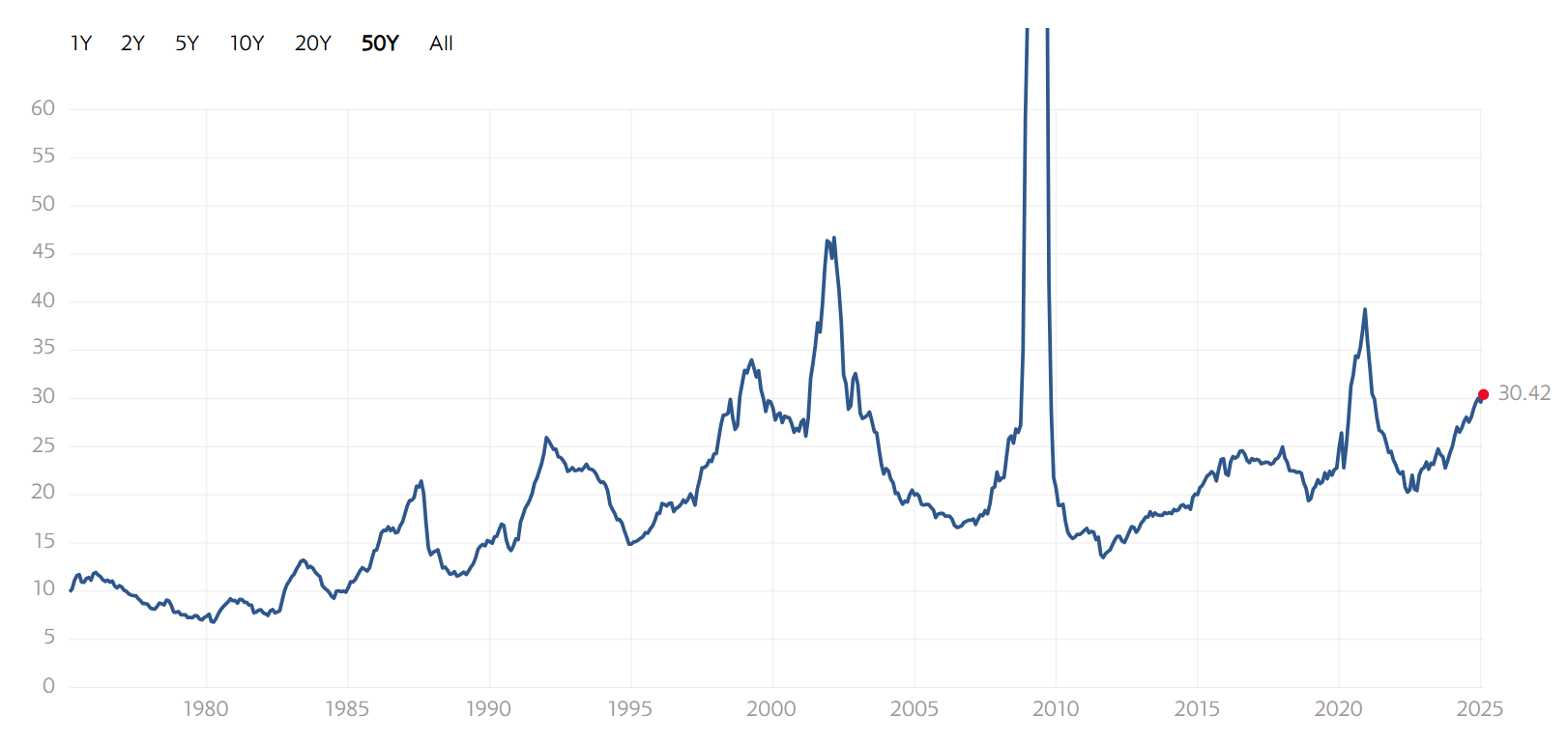전후 기간 S&P 500 지수의 평균 P/E는 약 16배 정도로, 이는 미래 20년 이상의 수익을 반영하는 수치로 해석됩니다 - 버블 시기의 P/E: