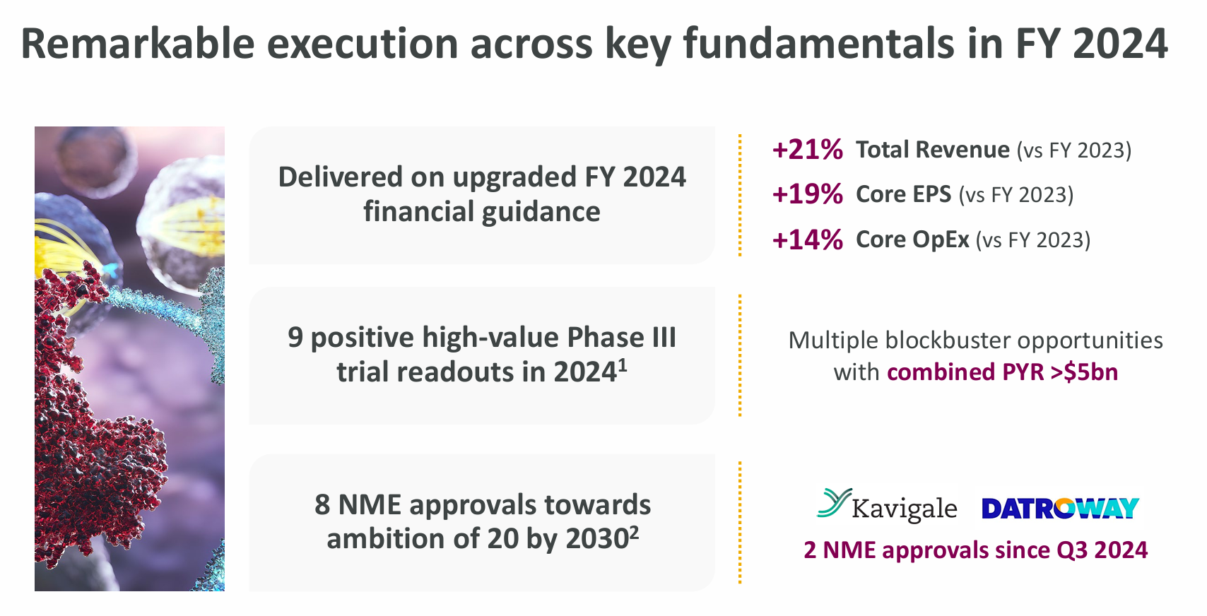 아스트라제네카는 2024년 연간 매출이 18% 증가한 540억 7천만 달러를 기록했으며, 4분기 매출도 24% 증가했습니다. 특히 종양학 분야 매출이 27% 증가하며 성장을 견인했습니다. 주당순이익(EPS)도 19% 증가했으며, 실적 발표 이후 주가는 5% 이상 상승했습니다