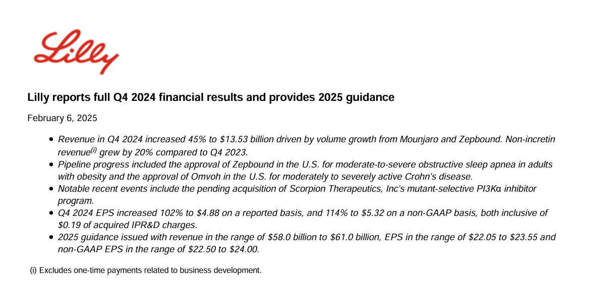 일라이 릴리는 2024년 4분기 실적에서 45% 증가한 135억 3천만 달러의 매출을 기록했으며, 비 GAAP 기준 EPS(주당순이익)는 114% 증가한 $5.32로 시장 기대치를 상회했습니다