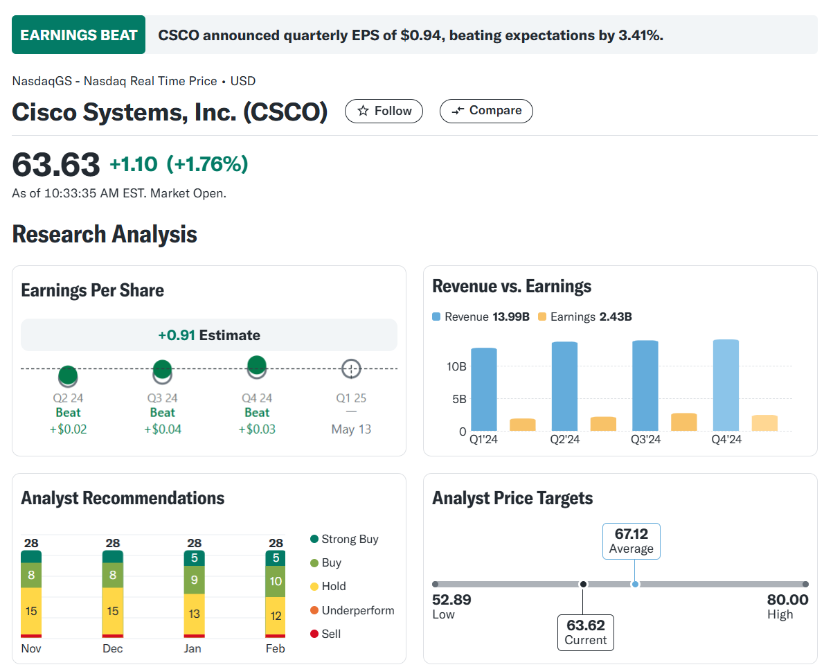 Cisco는 AI 인프라와 사이버 보안 등 고수요 분야에서 강력한 성장을 보이고 있으며, 안정적인 배당 정책과 상향된 가이던스로 장기 투자자에게 매력적인 선택지입니다. 다만, 거시경제적 불확실성과 기술 경쟁 심화 등의 위험 요인에도 주의가 필요합니다