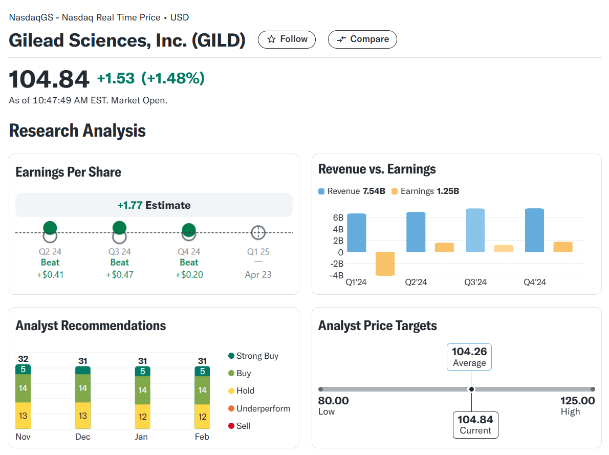 Gilead Sciences는 생명 위협 질환에 대한 의약품 개발, 연구 및 상업화에 주력하는 바이오 제약 회사입니다. 주요 치료 분야로는 HIV/AIDS, 간 질환(예: B형 및 C형 간염), 종양학, 그리고 염증성 질환이 있으며, 항바이러스 치료제 분야에서 업계 리더로 자리매김하고 있습니다