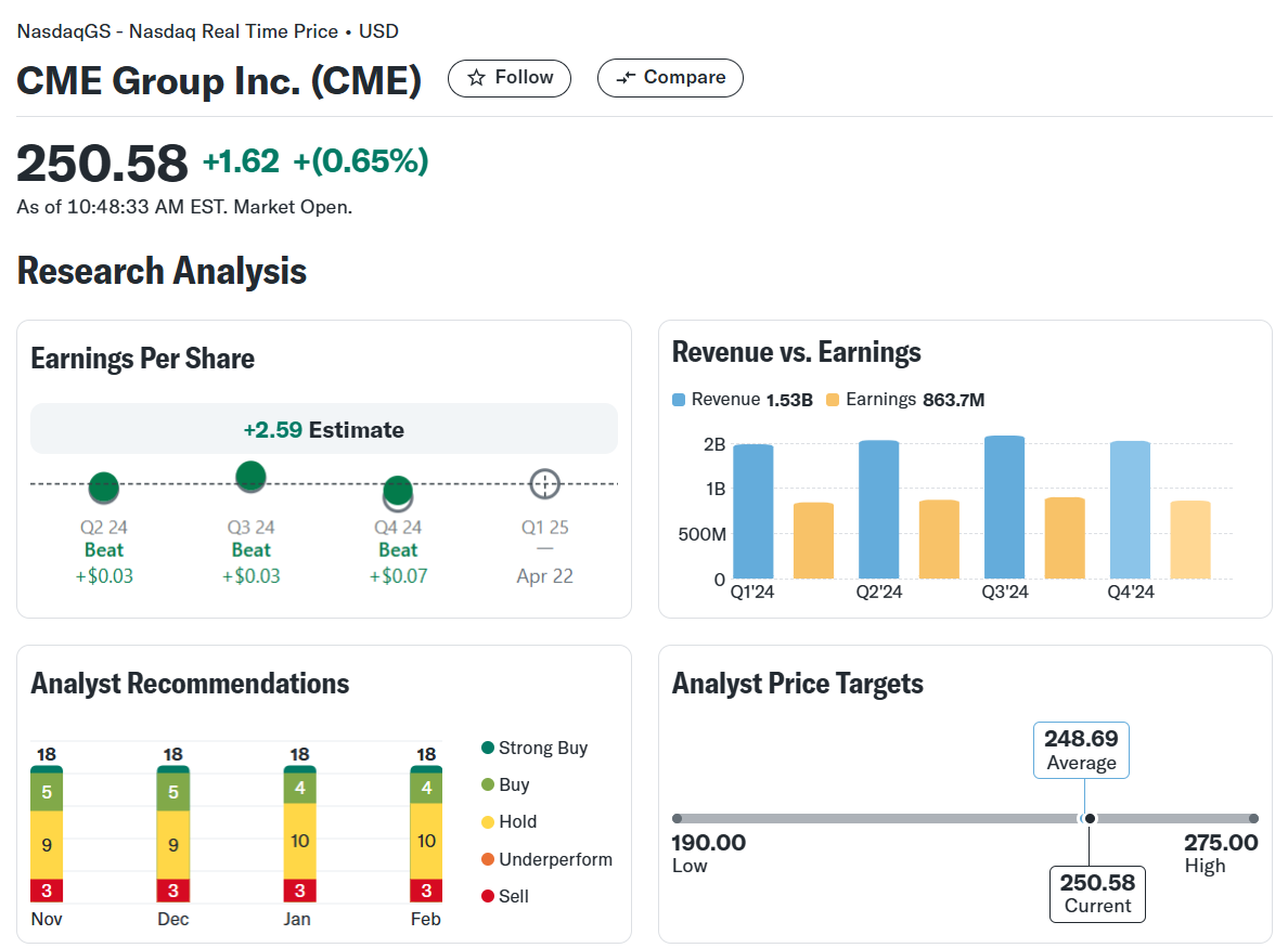 - CME Group Inc.: 다양한 파생상품 거래와 금융 인프라에서의 강력한 실적을 바탕으로, 글로벌 시장에서 안정적인 성과를 보여주고 있습니다