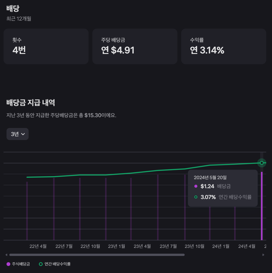 - 배당 지급 비율(Payout Ratio): 순이익 대비 배당금 비율이 50% 이하인 기업이 일반적으로 안정적입니다. 예를 들어, 애플(AAPL)의 배당 지급 비율은 약 25%로 매우 안정적입니다