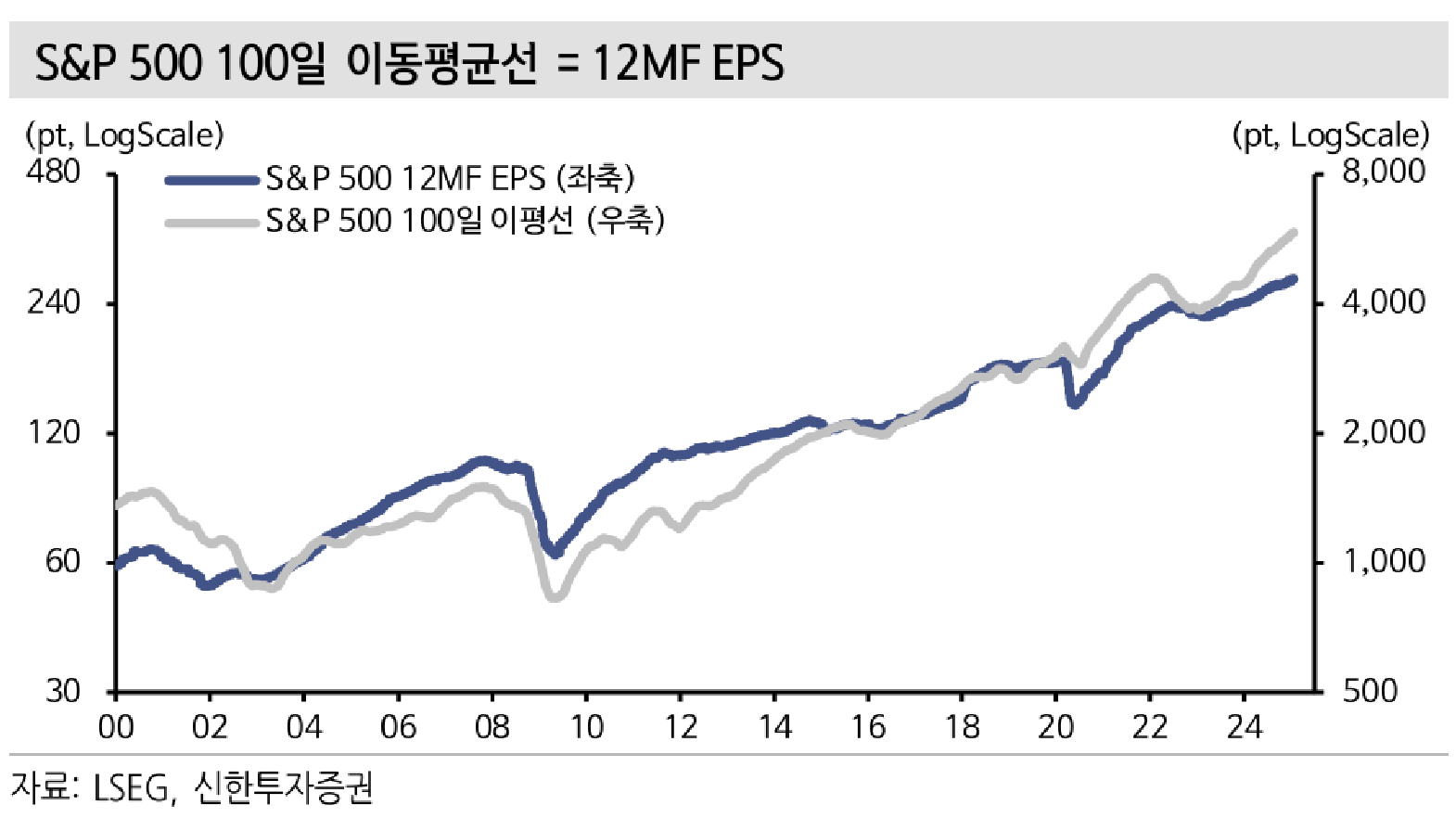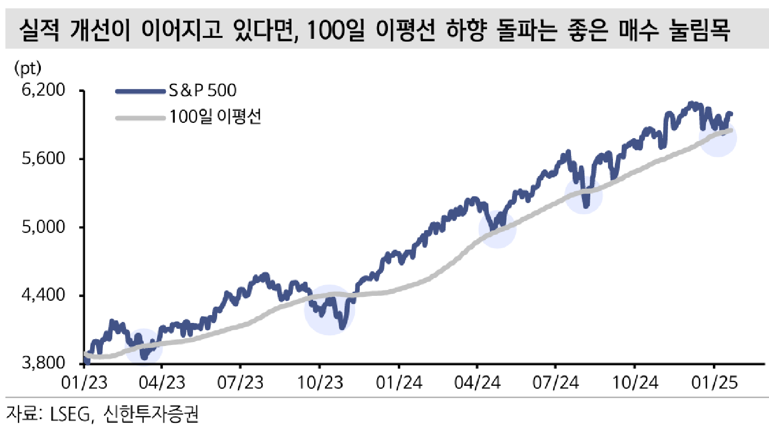 신한투자증권 보고서에서는 S&P 500의 100일 이동평균선을 중요한 기술적 지표로 언급합니다