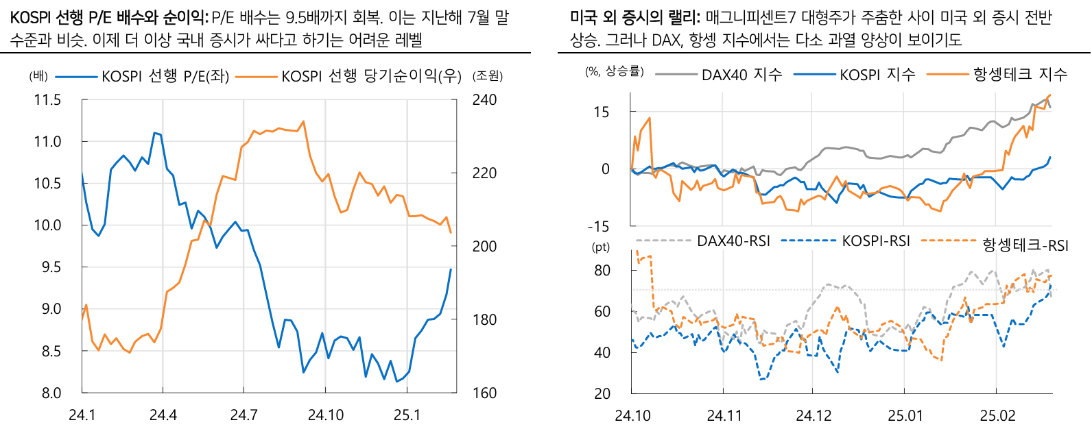 - P/E 배수 회복: KOSPI의 선행 P/E 배수가 9.5배까지 회복되었는데, 이는 지난해 7월 엔캐리 언와인딩 전, 지수가 약 2,800포인트였을 때와 유사한 수준입니다